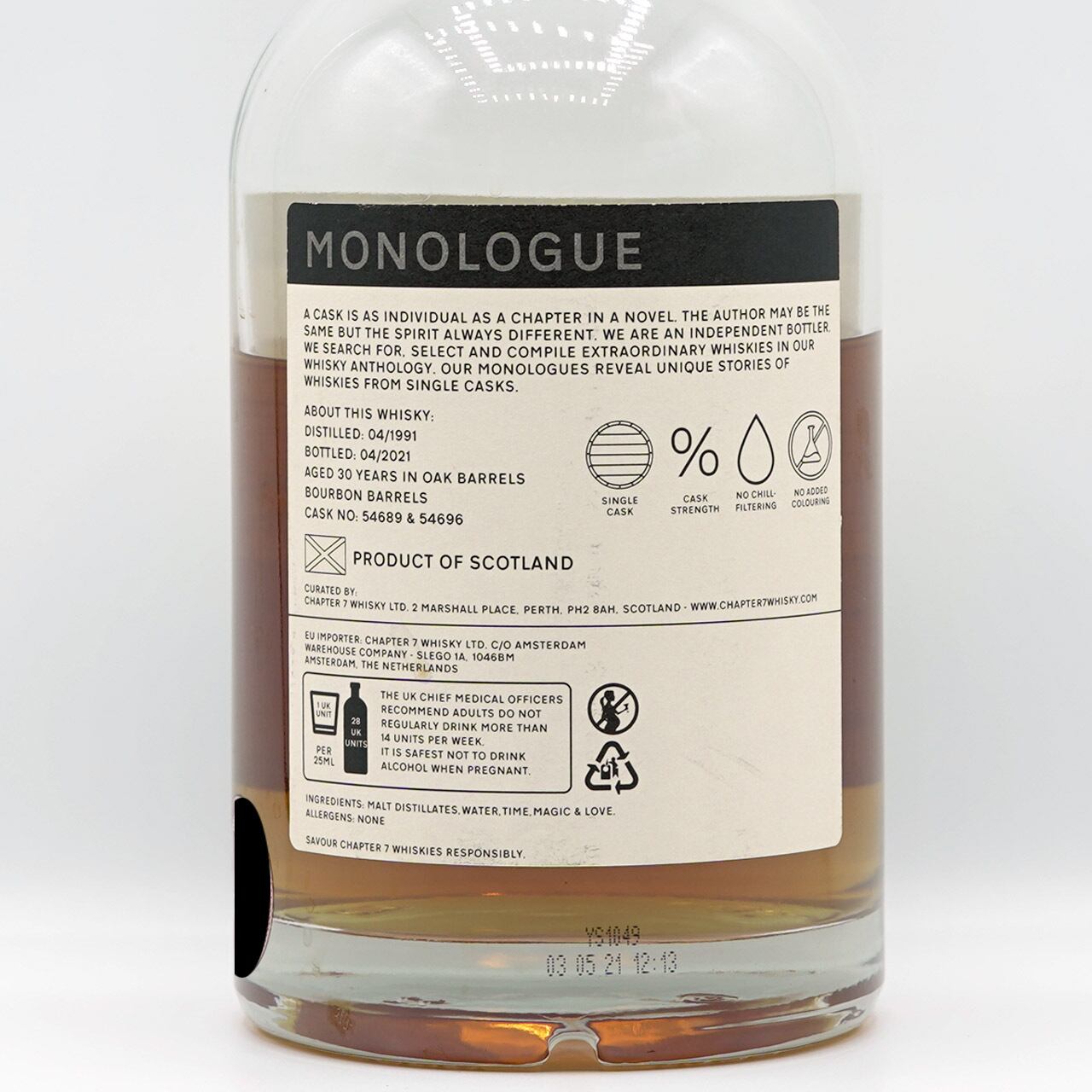 1991年に蒸留され、元バーボン樽で30年間熟成されたガーヴァン蒸溜所のシングルグレーンウイスキー。Chapter7が2021年にモノローグシリーズの一部として独自にボトリングしたもので、リリース数は547本。