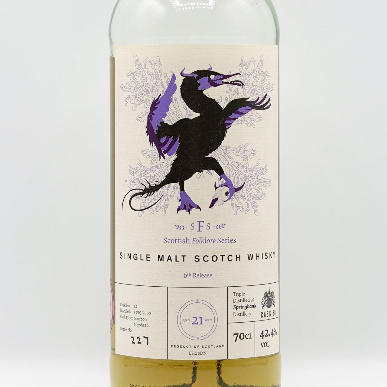 独立系ボトラーズであるカスク88による Scottish Folklore シリーズのシングルモルト。バーボン・ホグスヘッドで21年間熟成させたこのウイスキーは、正確には「スプリングバンク蒸溜所でノンピート、3回蒸留(!)」という特徴を持ち、シリーズ第6弾としてリリースされています。