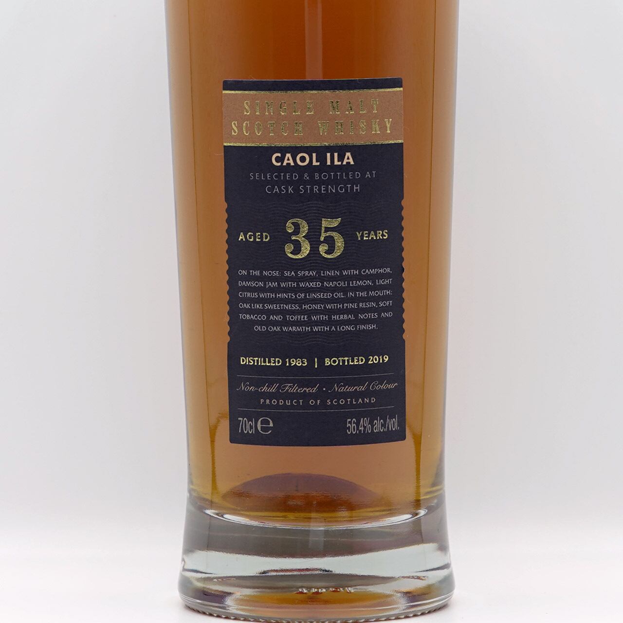 1983年に蒸留されたこのカリラは、2019年にボトリングされるまでシングル・リフィルシェリーカスクで35年間熟成されていた。ダムソンジャム、蝋引きしたナポリレモン、蜂蜜、タバコの香りを持ち、Gleann Mórよりナチュラルカラー、56.4%のカスクストレングスにてリリースされたボトル。